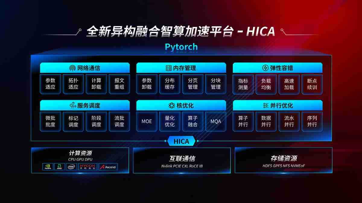 通过自研的服务层、、、、中间适配层、、以及调度编排算法,,,采用数据并行、、、模型并行等多种并行方式,,把并行计算任务进行有效的分解,,使其分别由相应的软件栈和算力资源来承接。。当GPU资源变化,,,HICA可以实时动态调度计算子任务并调整模型拓扑和架构,,,以充分聚合各种算力资源。。