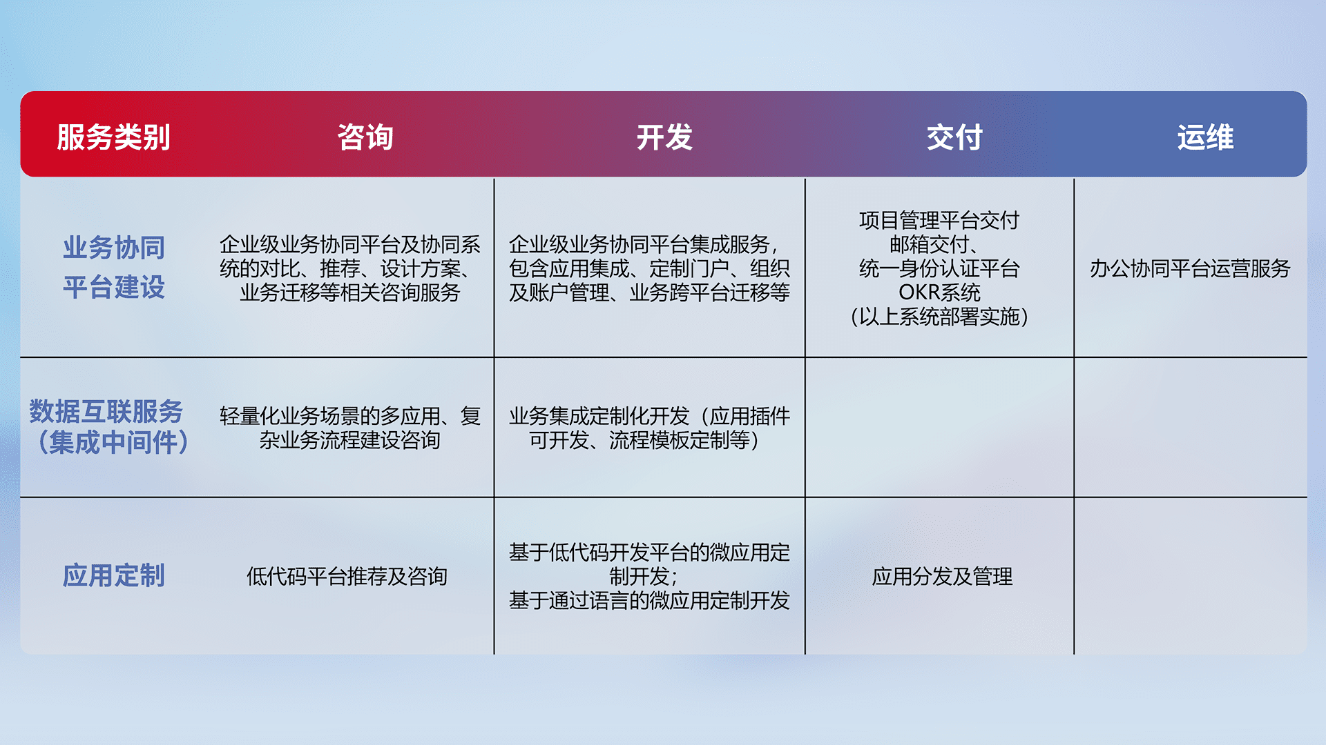 针对钉钉、、、、企微、、IDaas等平台级产品提供产品的规划、、、方案、、、、交付、、定制化开发等服务,,,实现如统一协同办公、、、、智能客户服务、、混合会议管理、、、、智能数据查询、、、、等业务场景,,,实现数字化转型。。。